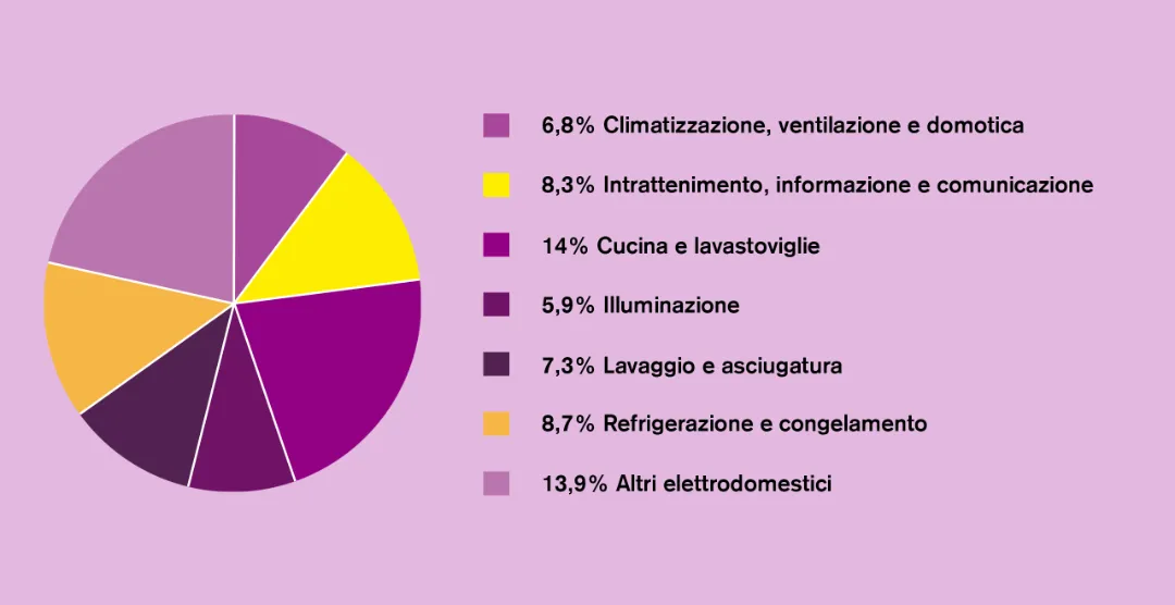 (Fonte: UFE, Analisi dei consumi svizzeri di energia per categorie di utilizzazione 2019, ad esclusione del riscaldamento degli ambienti e dell’acqua calda)
